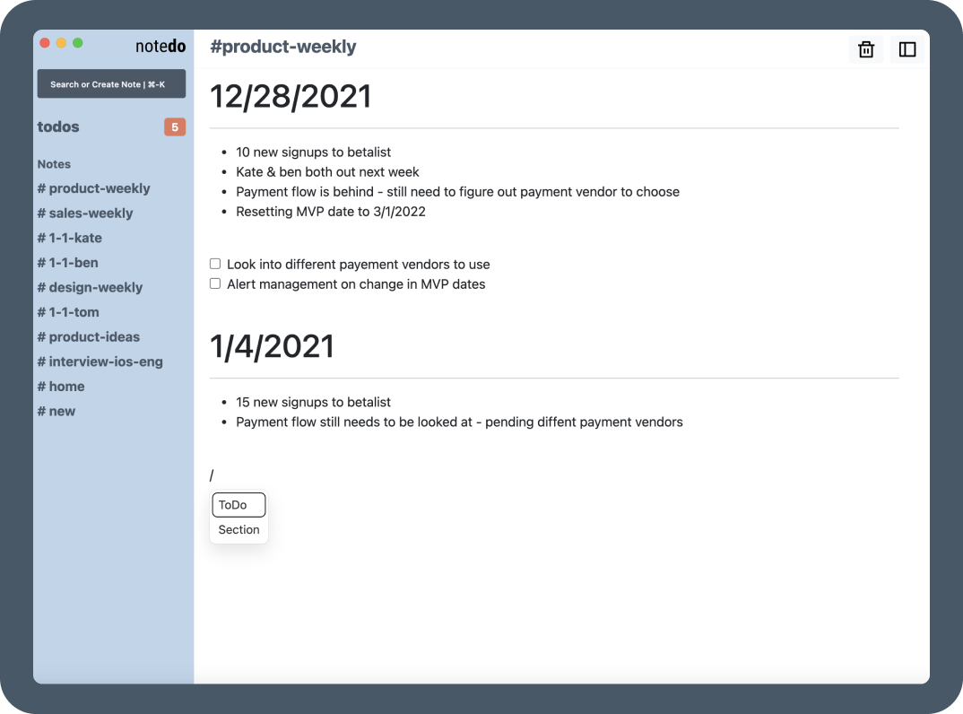 Slash Commands - Generate todos, sections, and more quickly with slash commands as you're taking notes.